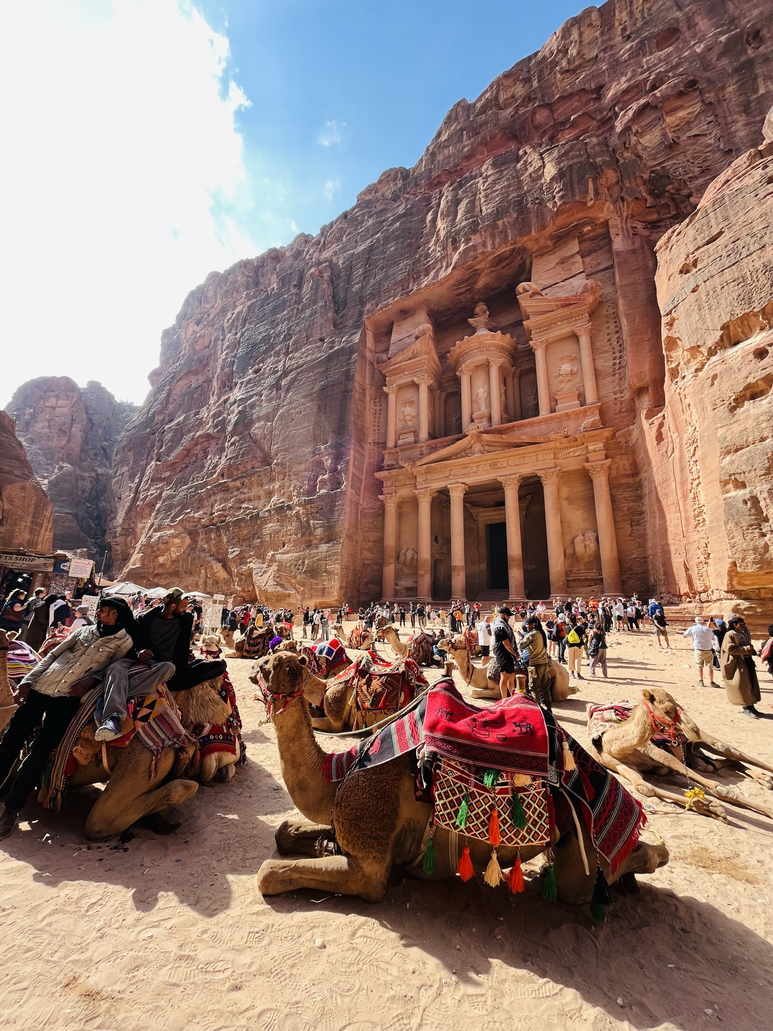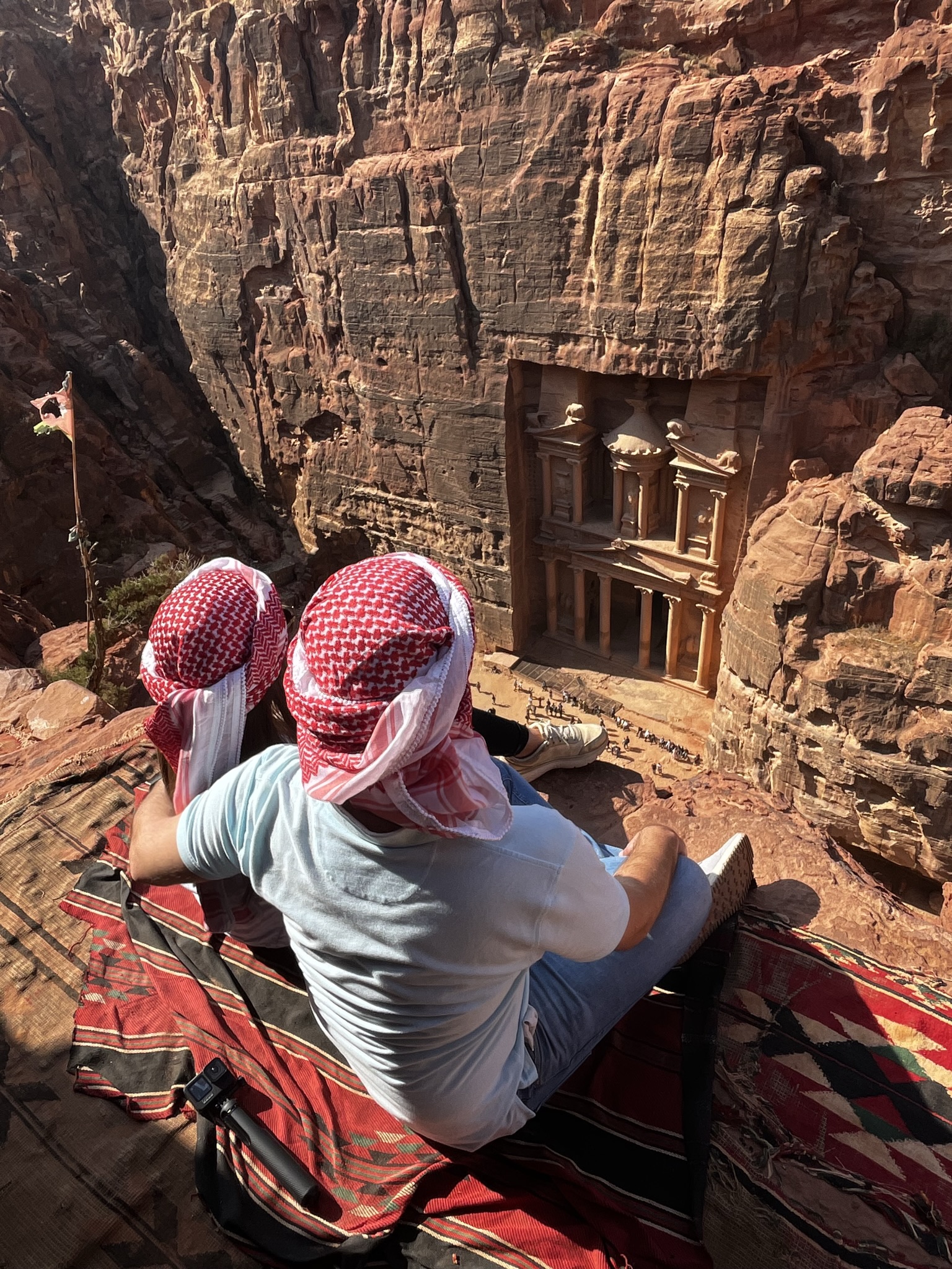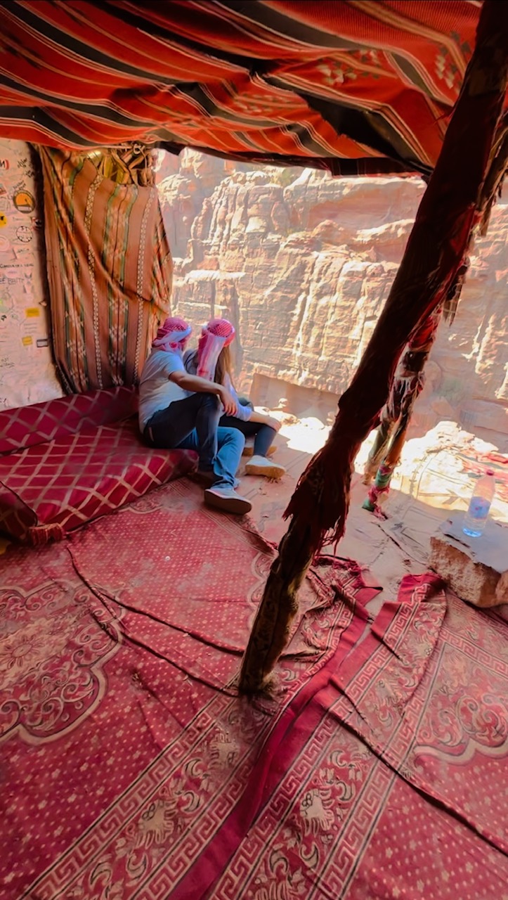 We, of course, paid for our teas. We chose the price, which was pretty much a tip and entirely voluntary, and decided to stay longer on the edge to contemplate the treasure further. We were the only ones in the tent for a while, thus it was difficult to estimate how much money this man could make in a day. When we paid him, he thanked us and immediately after he asked us for our phones, which was strange considering he didn’t even own one! What followed after was a 10 minute photography session with this man, leaving us incredible pics and, as I call them, influencer-style videos from the Treasury facade that we didn’t even know how to do! (I failed as an Instragrammer?) I couldn’t resist to ask this guy how he learned to master these photography skills, to which he just replied: “I understand what tourists want, and these photos will keep Petra close to their hearts“. I was just not expecting this toothless man to be such an expert and master my phone like a professional, and to date I wonder how much he could monetize his business to do more than survive! Yes, I have the capitalist chip so embedded.