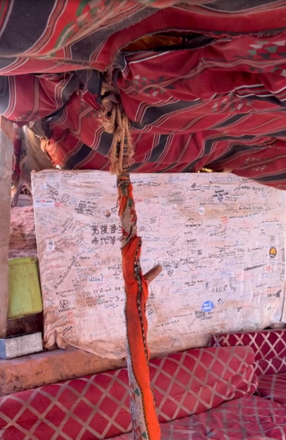 Once we reached the top, we saw a small tent with a hand-written welcome message in the entrance reading “Welcome to the place with the best view of Petra“. The tent was built inside a cave and it consisted of four large Bedouin-style reddish carpets extended on the floor and a few large cushions to rest your back if needed. No chairs, no tables, no menus, no loo. I was amazed to think that was the closest I would experience to a Bedouin lifestyle, as it was away from the touristic trap tents closer to the Petra Archeological Park entrance. The kitchen was right away in front of everyone, and consisted of a big pot where the man who welcomed us was constantly making Bedouin tea, a combination of water, black tea, and lots of sugar.